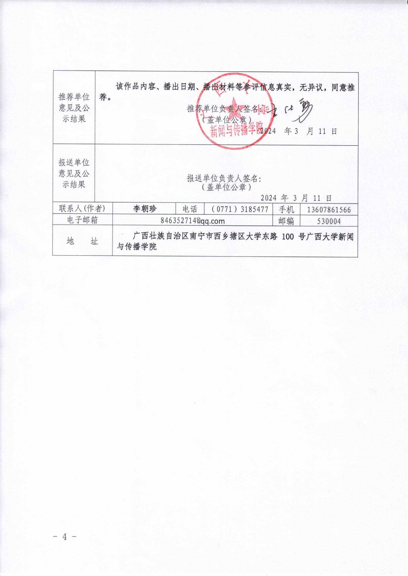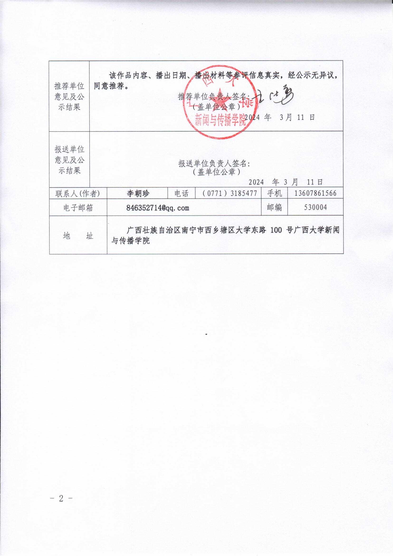 根据广西壮族自治区广播电视局、广西广电与网络视听协会发布的《关于2023年度广西广播电视和网络视听优秀作品推选报送工作的通知》(桂广发[2024]11号),现将公司参与报送的3份作品予以公示(作品内容详见附件)。公示时间:2024年3月11日至2024年3月15日。