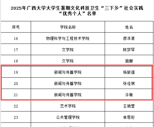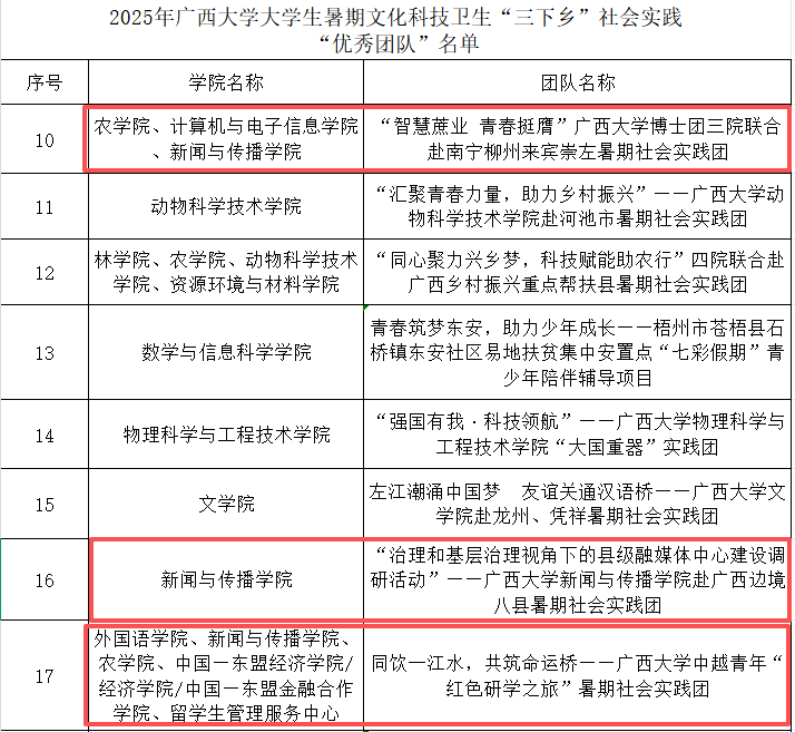 公司“治理和基层治理视角下的县级融媒体中心建设调研活动”--太阳集团tyc4633赴广西边境八县暑期社会实践团,与外国语公司、农公司、中国——东盟经济公司/经济公司/中国-东盟金融合作公司、职工管理服务中心联合的“同饮一江水,共筑命运桥“”--太阳集团tyc4633中越青年“红色研学之旅”暑期社会实践团,与农公司、计算机与电子信息公司联合“智慧蔗业 青春挺膺”太阳集团tyc4633博士团三院联合赴南宁柳州来宾崇左暑期社会实践团共3个团队获评“优秀团队”。