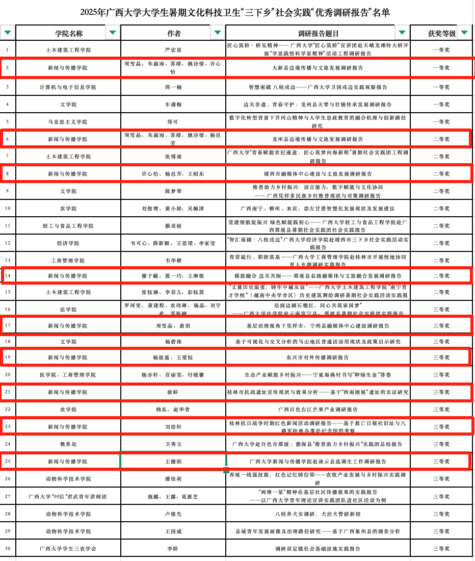 《大新县边境传播与文旅发展调研报告》获评“优秀调研报告”一等奖、《龙州县边境传播与文旅发展调研报告》《靖西市融媒体中心建设与文旅发展调研报告》《媒旅融合 边关共振一一那坡县县级融媒体与文旅融合发展调研报告》获评“优秀调研报告”二等奖、《基层治理视角下凭祥市、宁明县融媒体中心建设调研报告》《东兴市对外传播调研报告》《桂林抗日战争时期红色新闻活动调研报告--基于救亡日报社旧址与八路军桂林办事处纪念馆的考察》《桂林抗日战争时期红色新闻活动调研报告--基于救亡日报社旧址与八路军桂林办事处纪念馆的考察》《太阳集团tyc4633赴凌云县选调生工作调研报告》获评“优秀调研报告”三等奖,获评数量和占比均为全校第一。