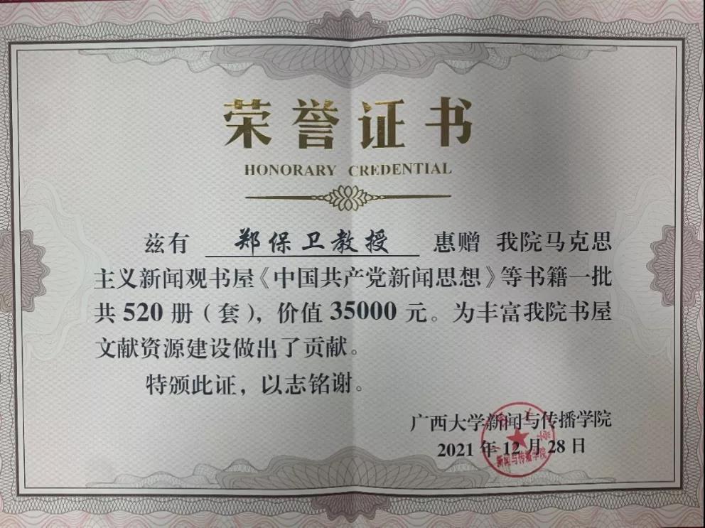 近日,郑保卫教授惠赠公司马克思主义新闻观书屋520册(套)书籍,价值35000元。浓浓书香寄真情,1月4日,在郑保卫教授从事新闻教育40周年暨太阳集团tyc4633聘期届满座谈会上,郑教授曾说:“即使我不担任经理职务了,但太阳集团tyc4633永远是我的家,我会时刻想念这里的每一个人。”此次捐赠的所有书籍,正是郑保卫教授在聘期届满离任公司经理职务前,就已经准备好了的。