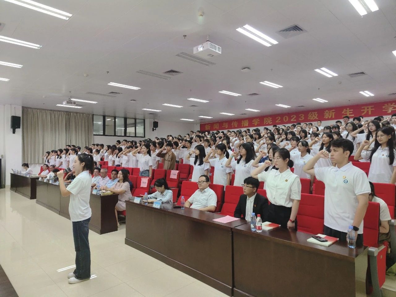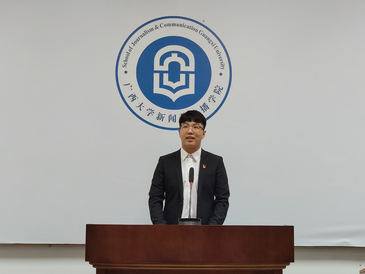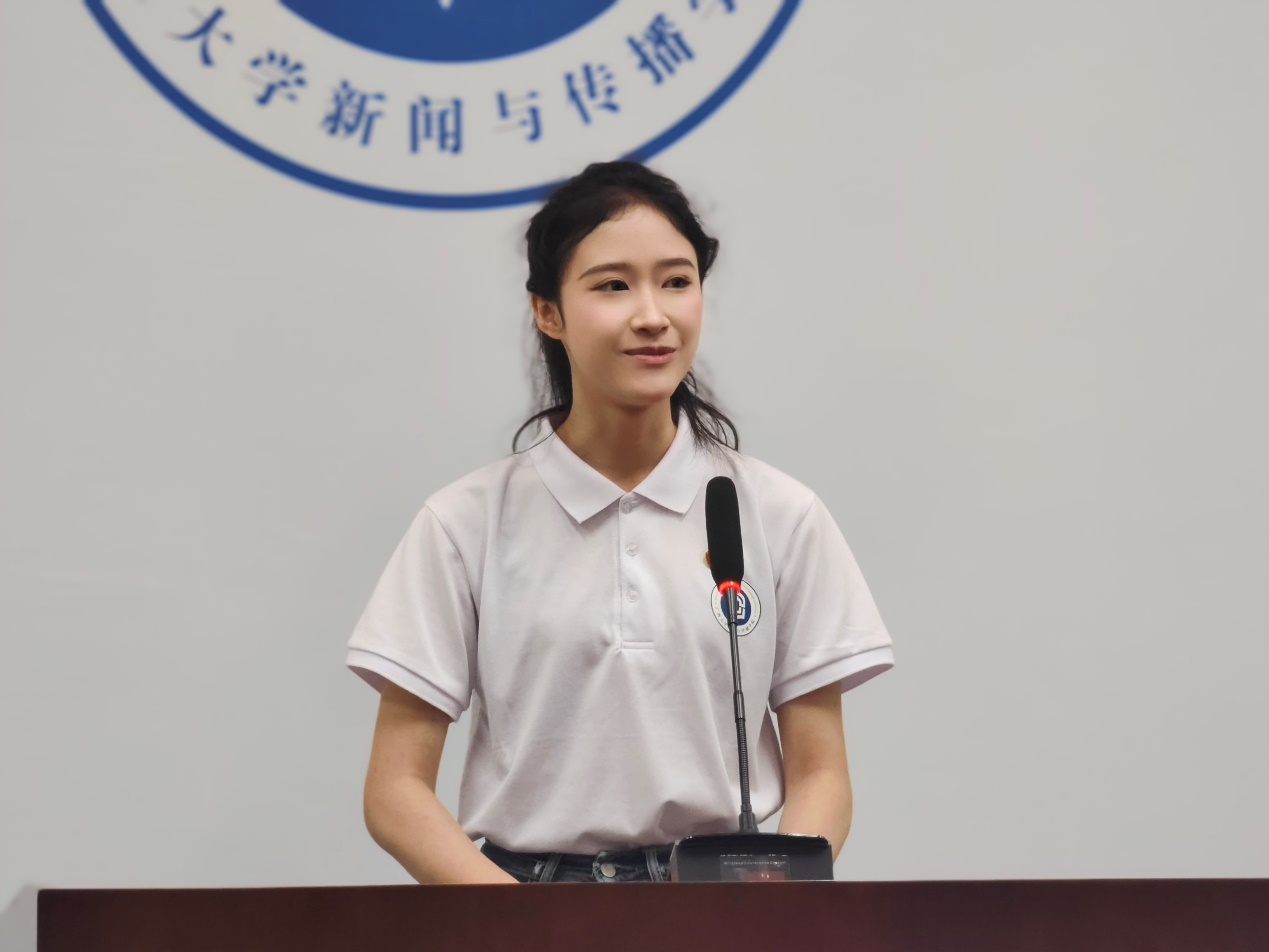 典礼开场,本科生新生代表播音与主持专业播音231班吴英娇发言,她表示,她的新闻理想是让无力者有力,为无声者发声,通过流畅而有力的语言,争做优秀新闻工作者,传递正能量,并希望能够在老员工活中不断探索、不断体验,用不怕输的自信与勇气去迎接每一个新挑战,释放青春热血。
