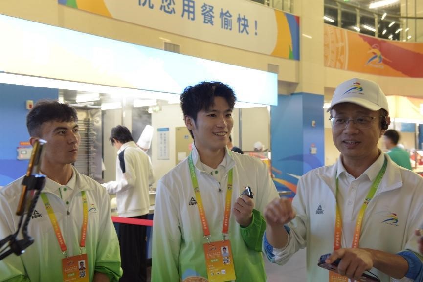 接着,探访队乘坐观光车来到运动员餐厅。餐厅门口,身穿壮族服饰的工作人员笑容可掬,迎接每一位进入餐厅的客人。进入餐厅,最先映入眼帘的是两面“友谊签名墙”,墙上不仅写满了来自全国各地的运动员签名,还写有“加油必胜”、“友谊第一,比赛第二”等话语,充分体现了全国各地运动员的竞赛热情和友好的竞赛心态。南宁市执委会青运村工作人员许宁军为大家介绍运动员餐厅,他说道,运动员餐厅就餐区共可容纳3850人同时就餐,供餐方式为半自助型供餐,每天18个小时不间断供餐,这可以保证运动员随时都能吃上新鲜热乎的饭菜。再往里走,能够看到各种地方风味的食堂窗口,运动员可以根据自己的口味和习惯来选择合适的菜品。许宁军依次介绍了广西风味、晋鲁风味、苏浙风味等区域的美食。其中,还特别设有清真餐厅,阿西木江为大家介绍了清真餐厅的各种菜品,他表示,餐厅准备得很周到,充分考虑到了运动员的不同需求。餐厅服务人员积极热情,在此用餐的运动员表示“对餐厅感到很满意,菜品都很丰盛、很好吃”。