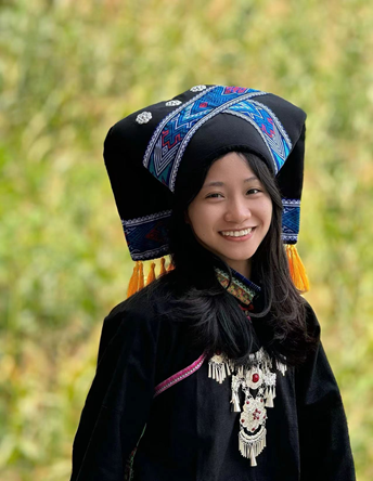 调研组成员许心怡(壮族)同学体验黑衣壮民族服饰(唐琳 摄)