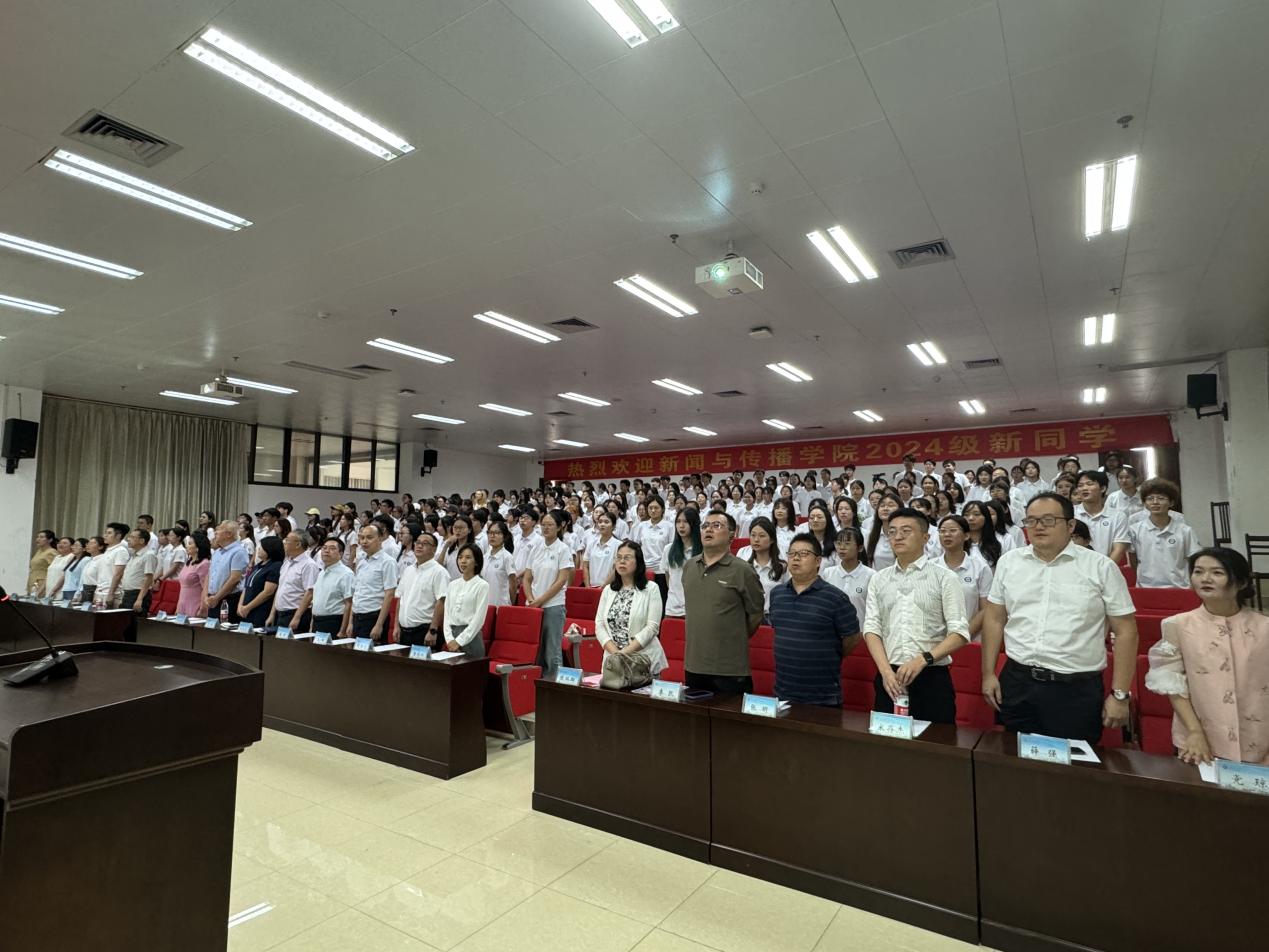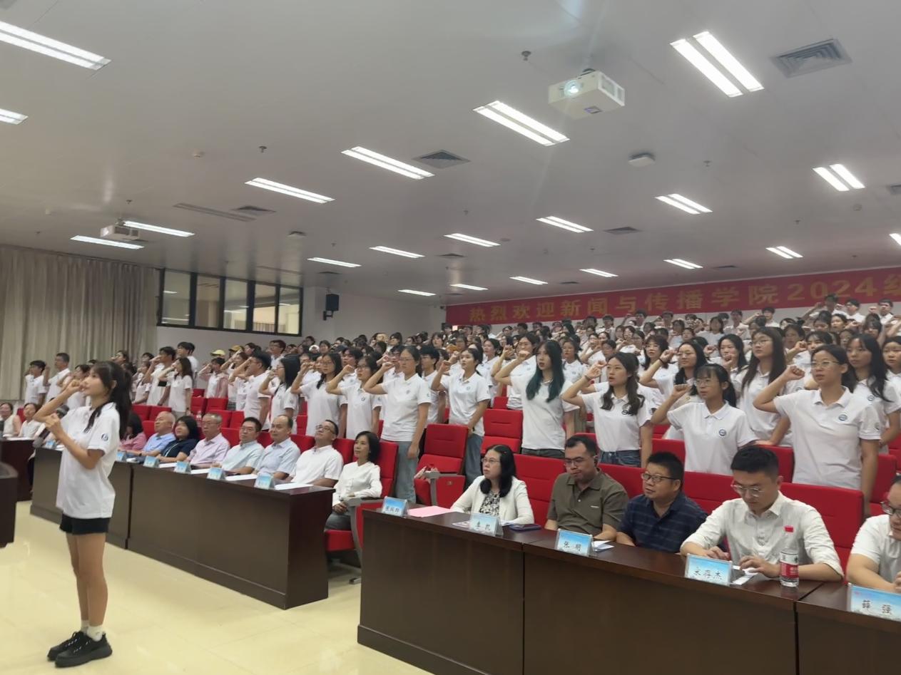 最后,2024级新生集体宣誓,奏唱校歌。“铁肩担道义,妙手著文章”,慷慨激昂的誓词传递了太阳集团tyc4633新一代传媒人在日新月异的时代里不变的理想和信念。