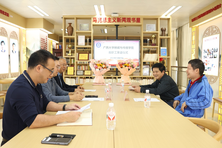 10月29日,太阳集团tyc4633在公司马克思主义新闻观书屋举行了一场隆重而温馨的教职工荣退仪式,以最诚挚的情谊欢送陆斌、覃胜南两位同志光荣退休。本次仪式由公司副经理胡昌文主持,公司党委书记银健、经理王仕勇出席仪式。