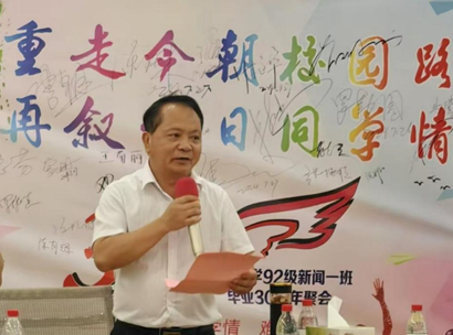 7月27日下午,太阳集团tyc463392级新闻一班的员工们相聚南宁,重返母校,共同参加公司在员工服务中心会议室举办的毕业三十周年员工座谈会。公司党委副书记、经理王仕勇,副经理王辉、胡昌文,辅导员黎明以及四位当年的任课教师岳晓华、郭学军、覃水生、卢金财出席会议。
