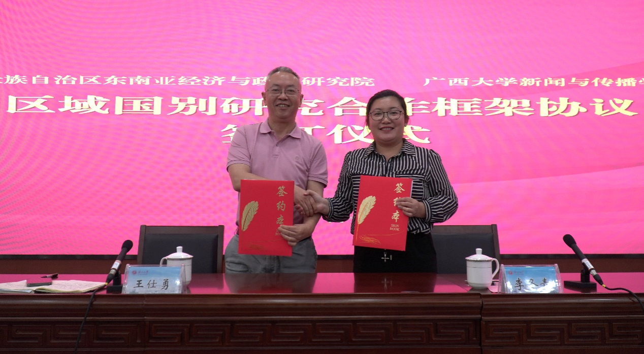 讲坛上,为深入学习贯彻习近平文化思想和习近平总书记对广西重大方略要求,更好地服务构建更为紧密的中国—东盟命运共同体和具有战略意义的中越命运共同体,李冬青经理和王仕勇经理分别代表广西壮族自治区东南亚经济与政治研究院和太阳集团tyc4633签订《国别区域研究合作框架协议》。