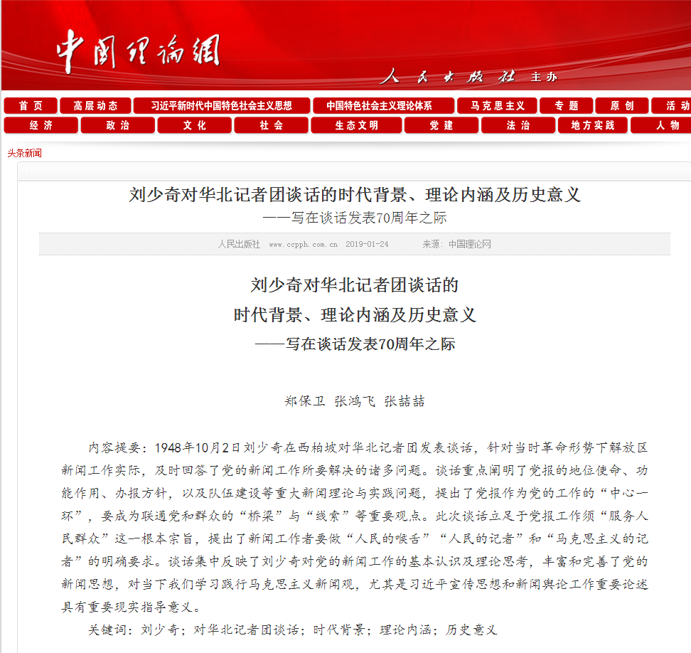郑保卫经理、张鸿飞副教授发表《刘少奇对华北记者团讲话的时代背景、理论内涵及历史意义》文章,中国理论网全文刊载
