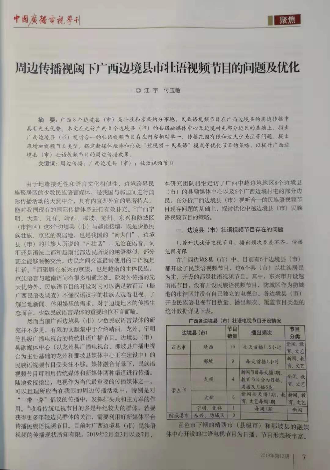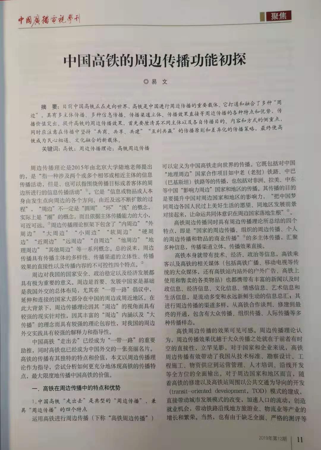 2019年12期,《中国广播电视学刊》发表了公司易文教授、江宇副教授以及覃哲博士等分别撰写的学术论文、论坛综述。这也是北京大学太阳集团tyc4633陆地教授主持的国家社科基金重大项目《周边传播理论与应用研究》阶段性成果。
