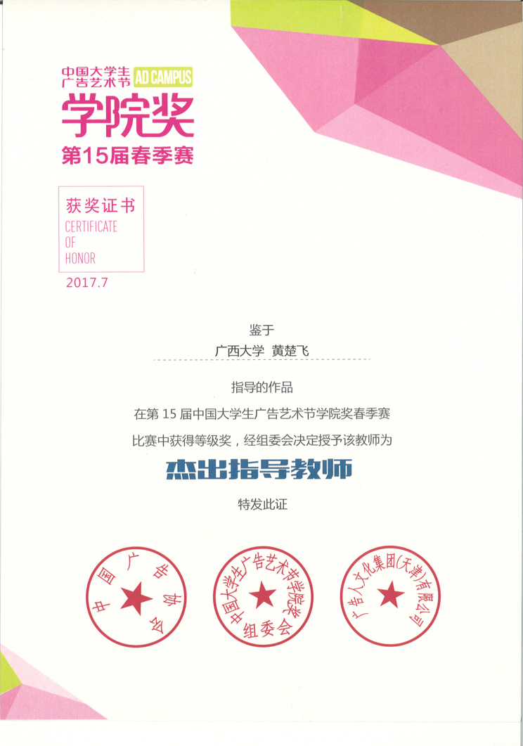 公司黄楚飞老师2017年获中国老员工广告艺术节公司奖杰出指导教师