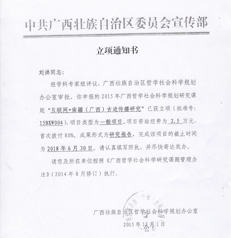 公司刘洪教授2015年申报广西社科项目获得立项