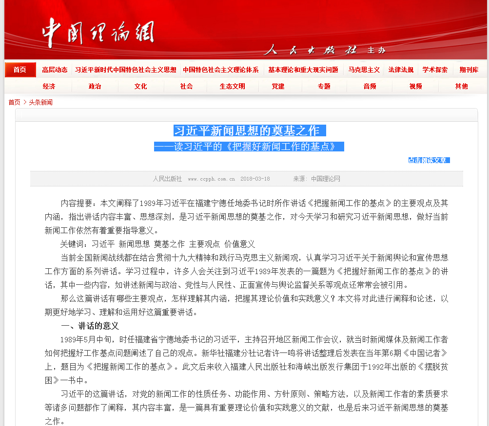 郑经理最新文章《习近平新闻思想的奠基之作——读习近平的<把握好新闻工作的基点>》荣登中国理论网大头条