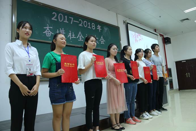 接着,刘诚老师和奋进社社长肖语语同学共同为奋进社优秀干部和先进个人代表颁奖。