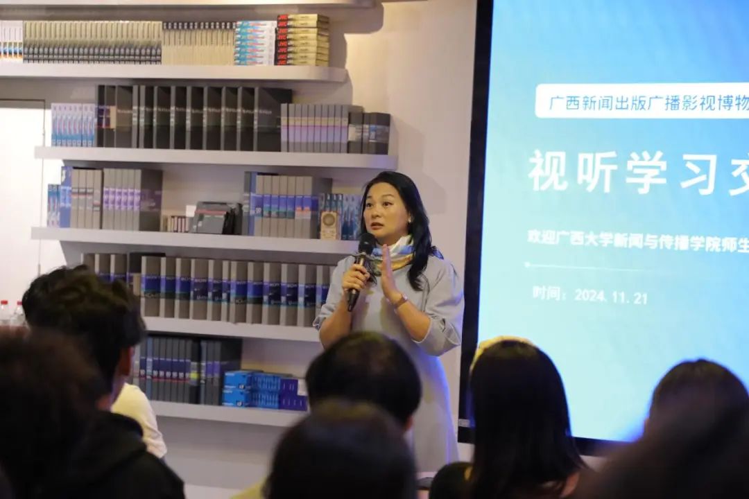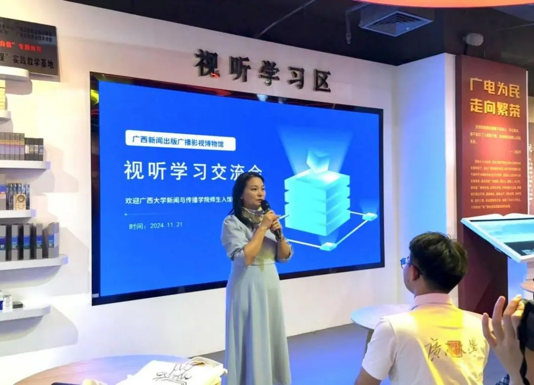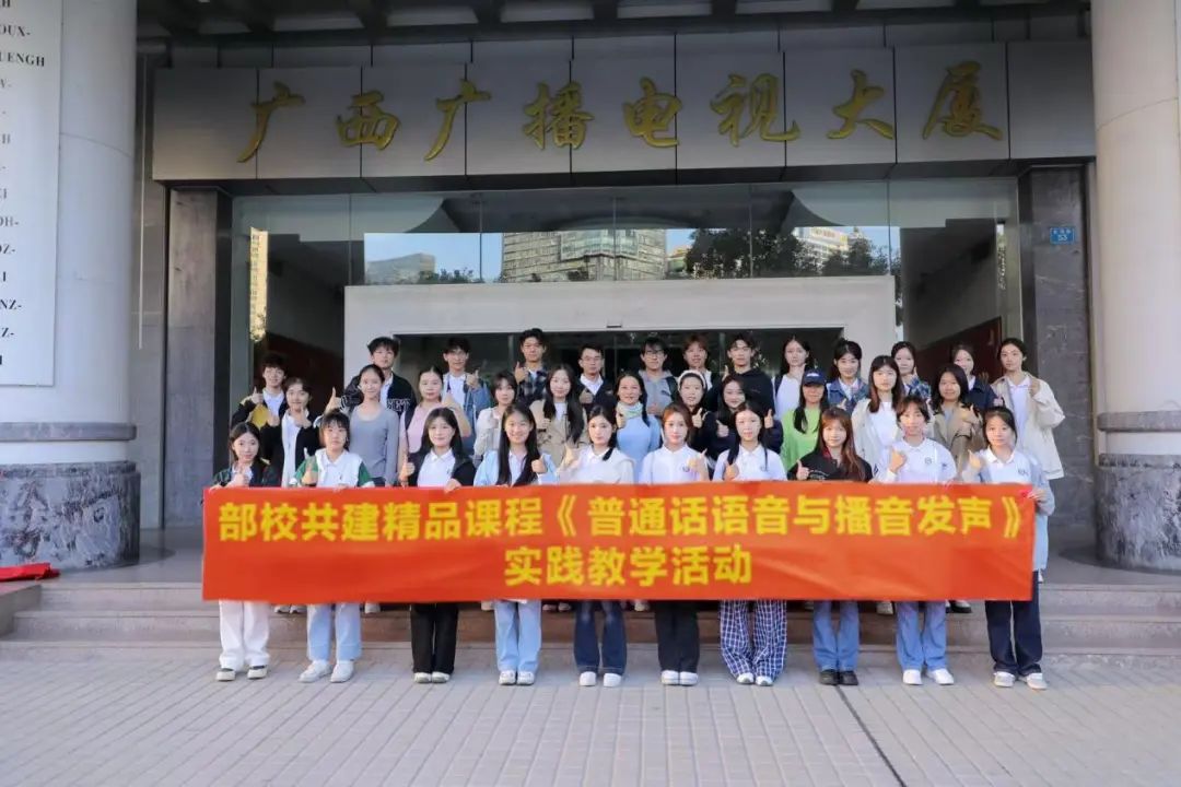 2024年11月21日,在太阳集团tyc4633部校共建精品课程《普通话语音与播音发声》课程负责人李朝珍教授的带领下,播音与主持艺术专业2023级、2024级本科生,前往广西新闻出版广播影视博物馆进行校外创新实践教学活动。
