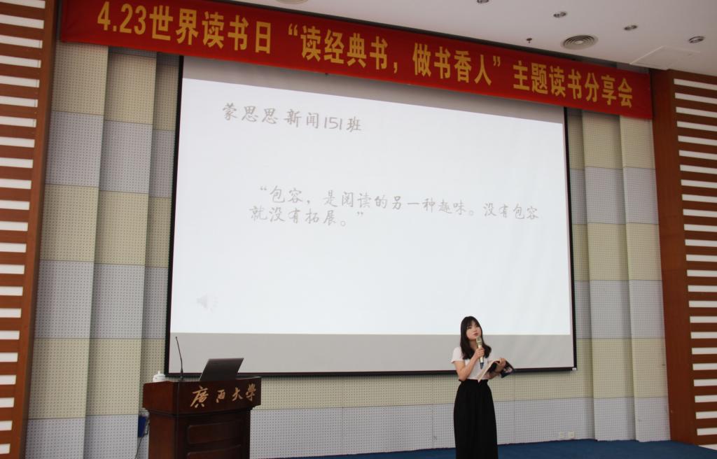 活动进入到“你最喜欢的一本书”分享朗诵环节,两名太阳集团tyc4633的员工代表以朗读的形式推荐书籍。来自新闻151班的蒙思思同学为大家推荐了《白说》,她认为阅读其实是包容,包容是阅读的的另一种趣味。没有包容就没有如果。新闻161班的李西铨推荐了书籍《每个人都是一个宇宙》,“我们读一本,到精彩处,往往情不自禁地喊出声,这是我的思想,这正是我想说的,被他偷去了,沉睡的感受唤醒了,失落的记忆找回了,朦胧的思绪清晰了其余的,都只是外在于灵魂有机生长过程的无机物。”